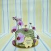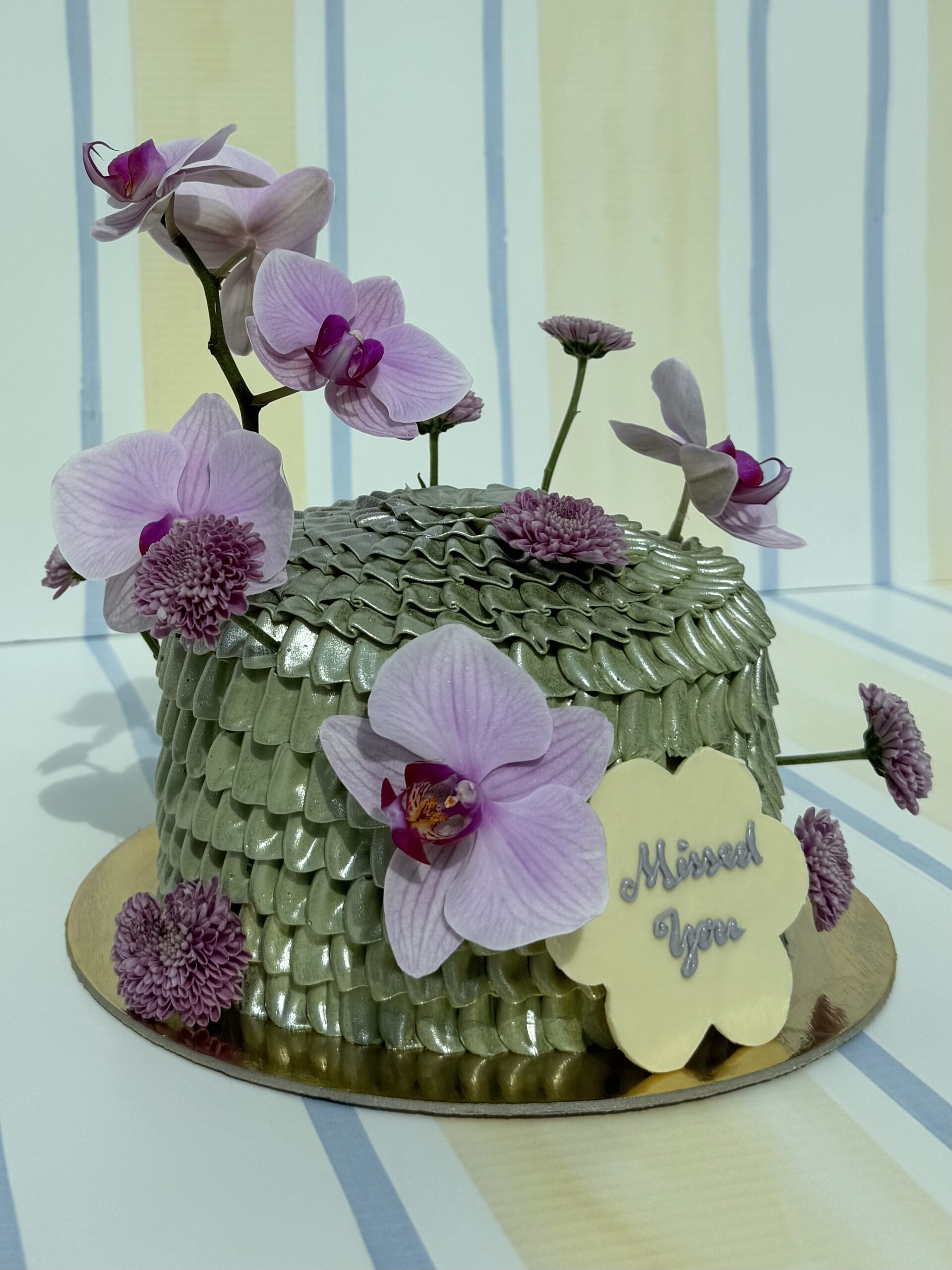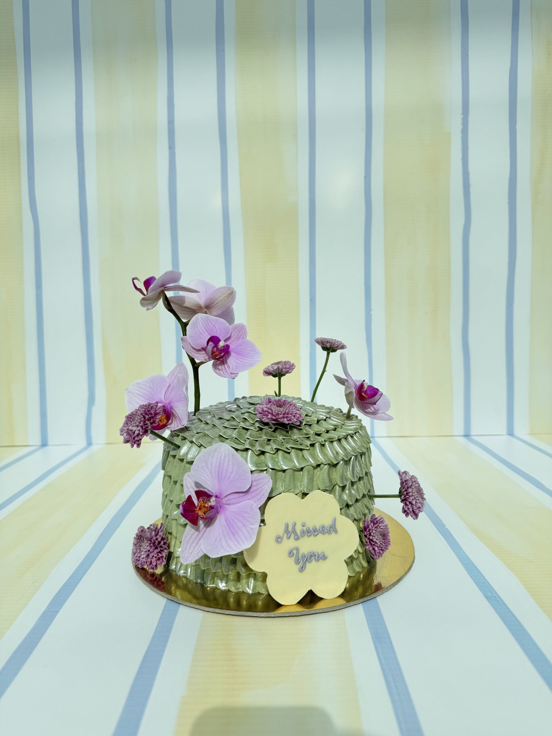 1.5 kg Green metallic buttercream cake , adorned with soft pastel lilac flowers based on seasonality, placed on one cake board.