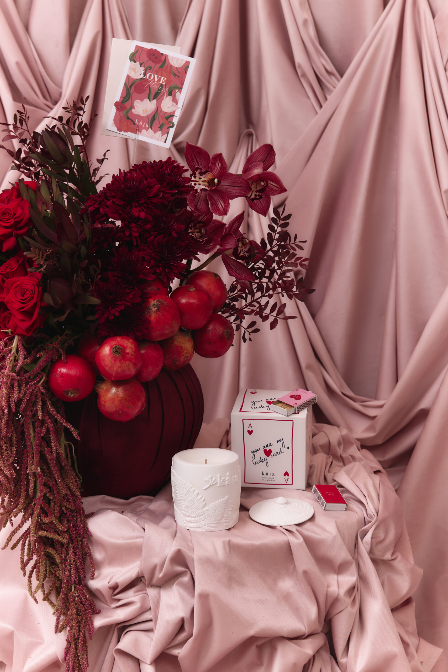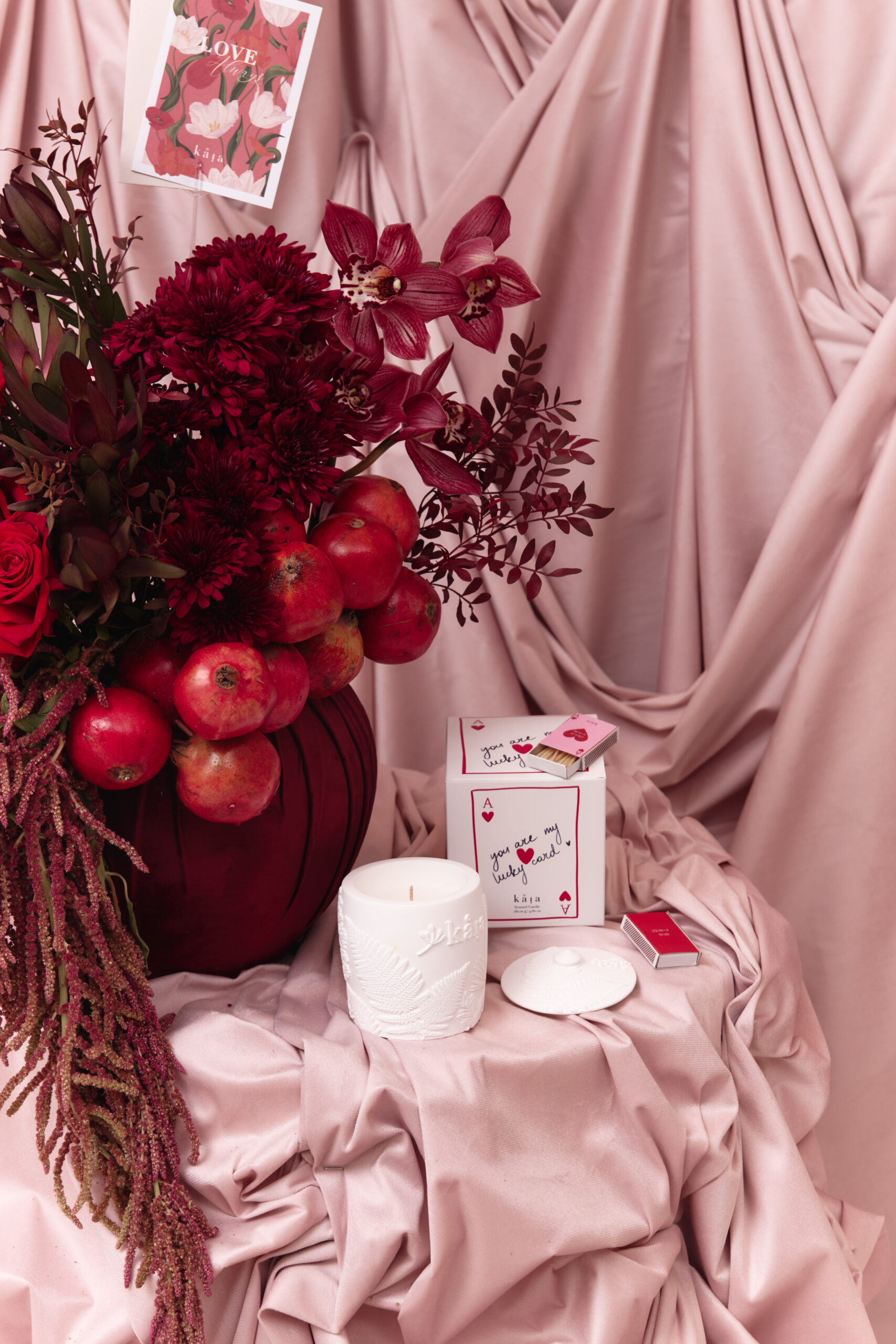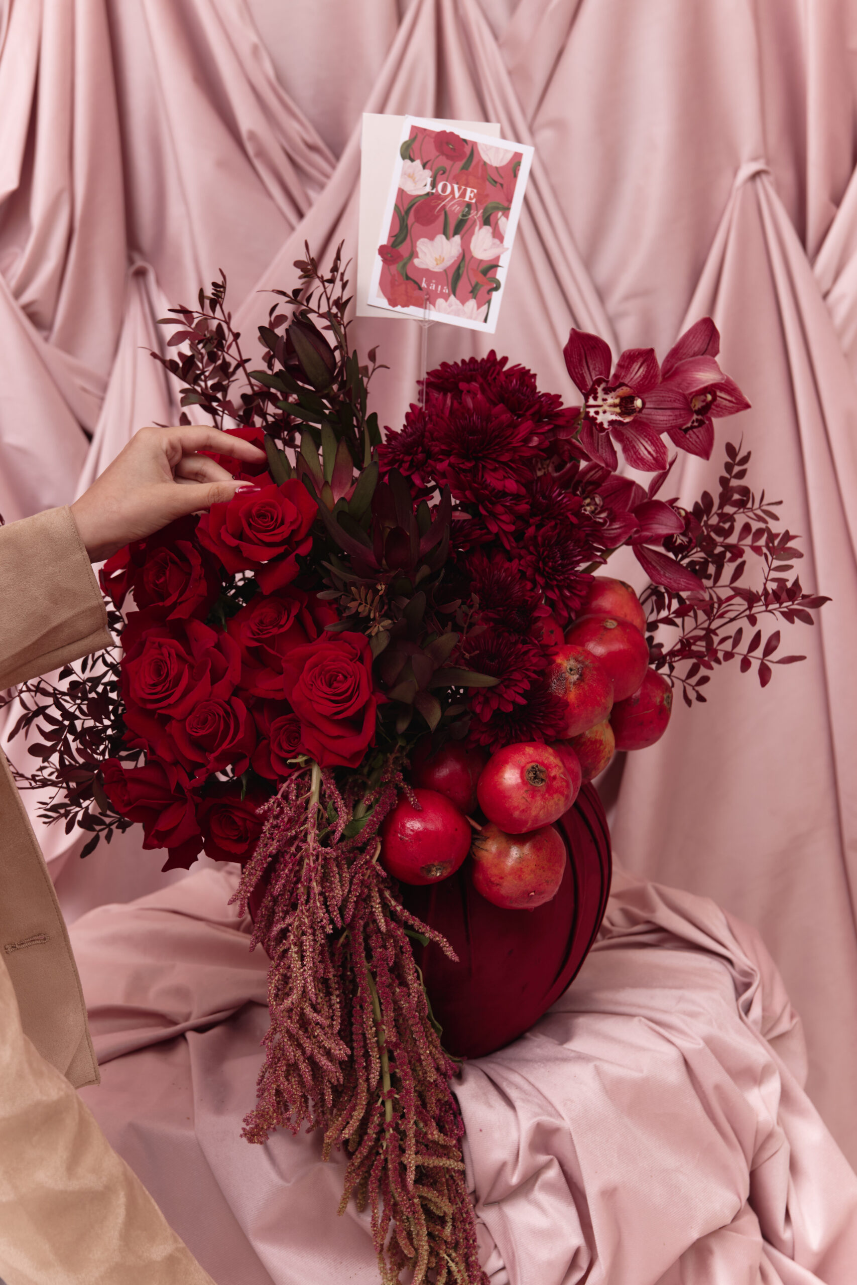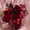 Mixed red and maroon flowers with hanging red pomegranates in a maroon velvet covered vase arrangement. Flowers may vary based on availability and seasonality, in the instance that a variety isn’t available, it will be replaced with that of equal or higher value.