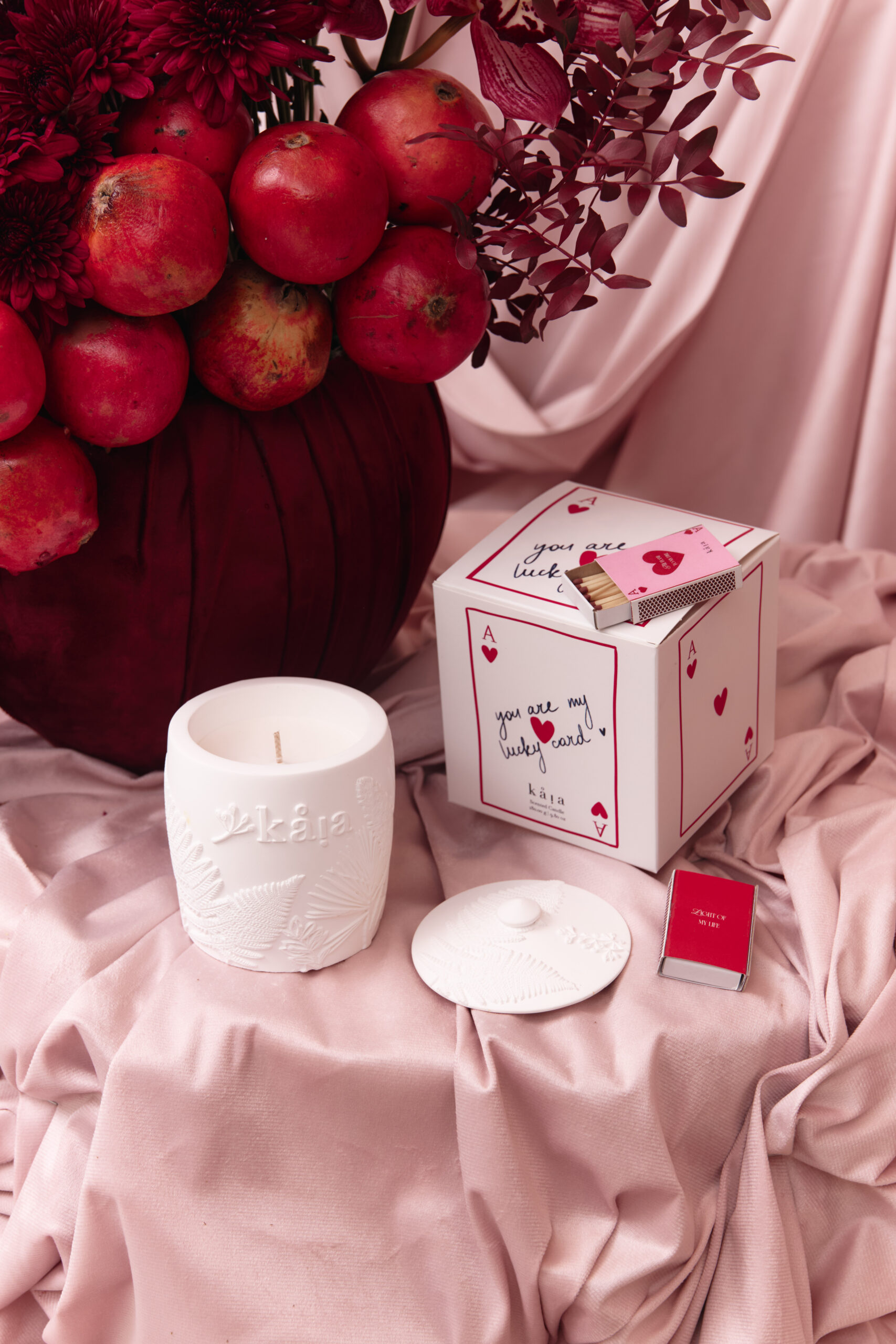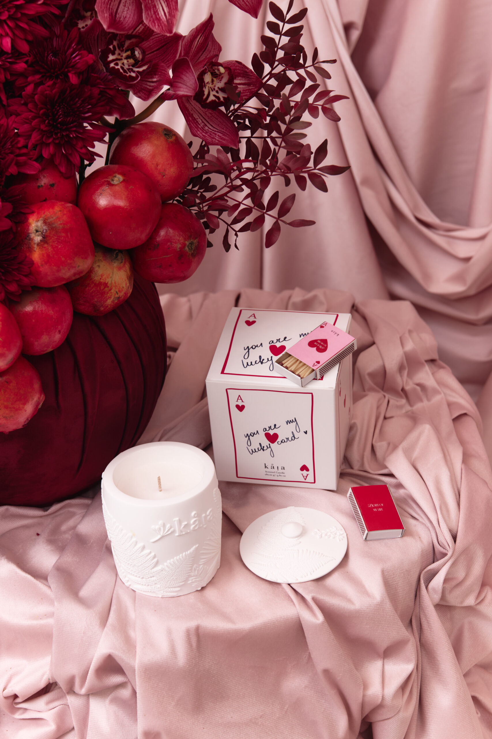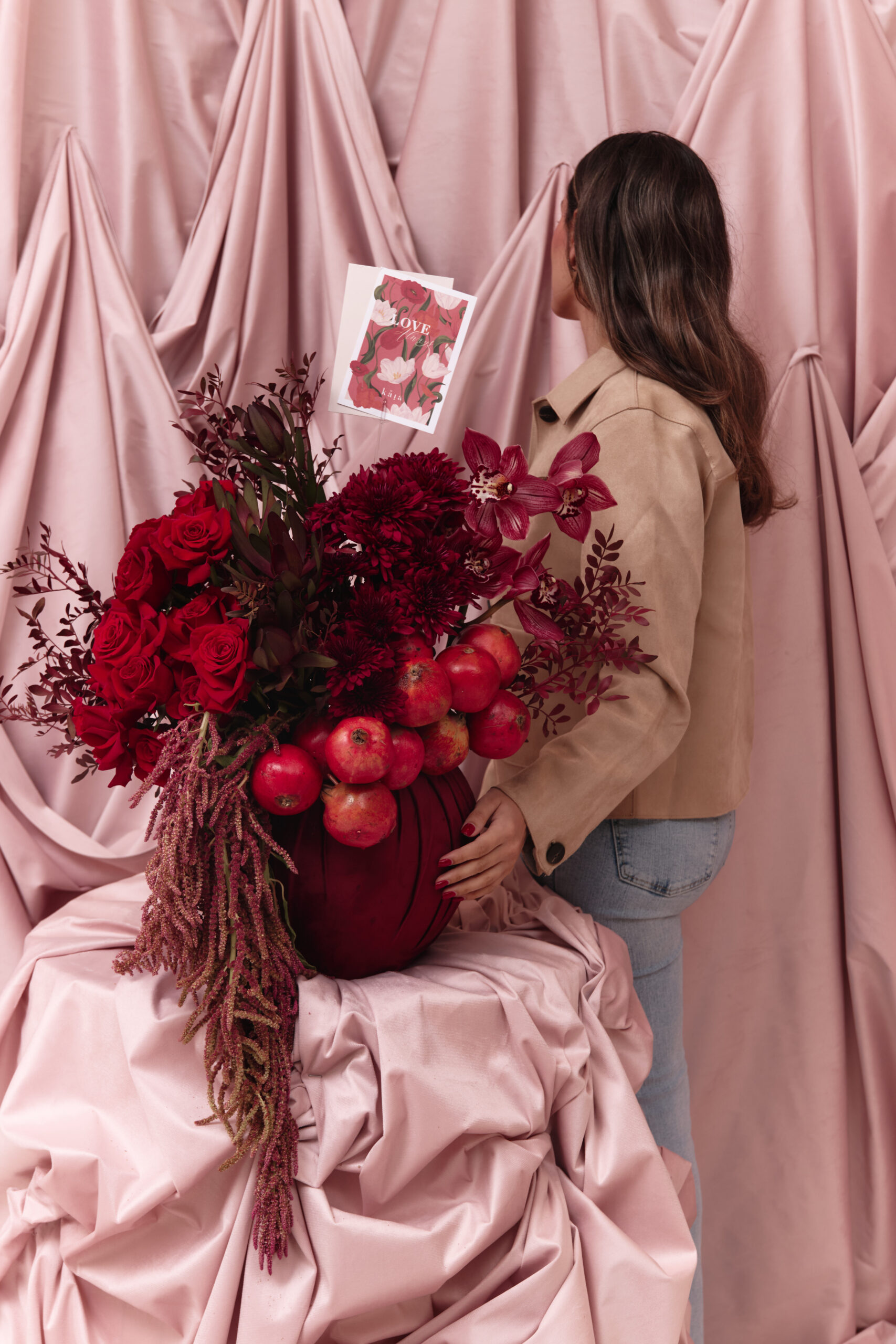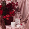 Mixed red and maroon flowers with hanging red pomegranates in a maroon velvet covered vase arrangement. Flowers may vary based on availability and seasonality, in the instance that a variety isn’t available, it will be replaced with that of equal or higher value.