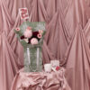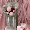 Mixed light pink and red flowers arranged in a bouquet and placed in a flower bag. Flowers may vary based on seasonality and availability. In the instance that a flower is unavailable, it will be replaced with that of equal or higher value.