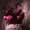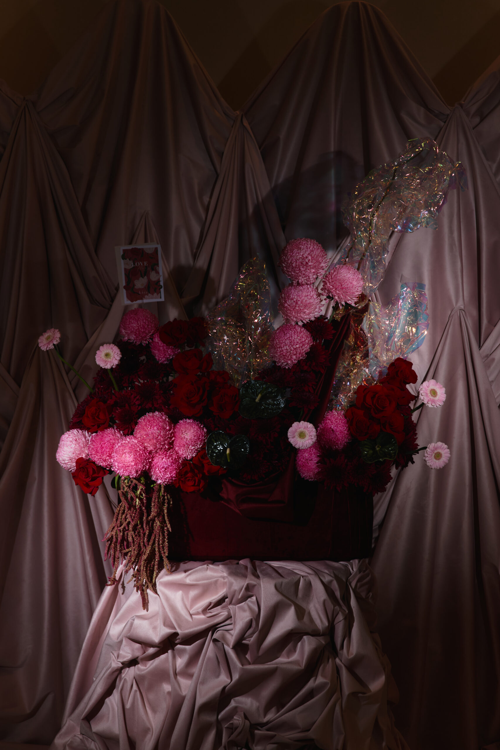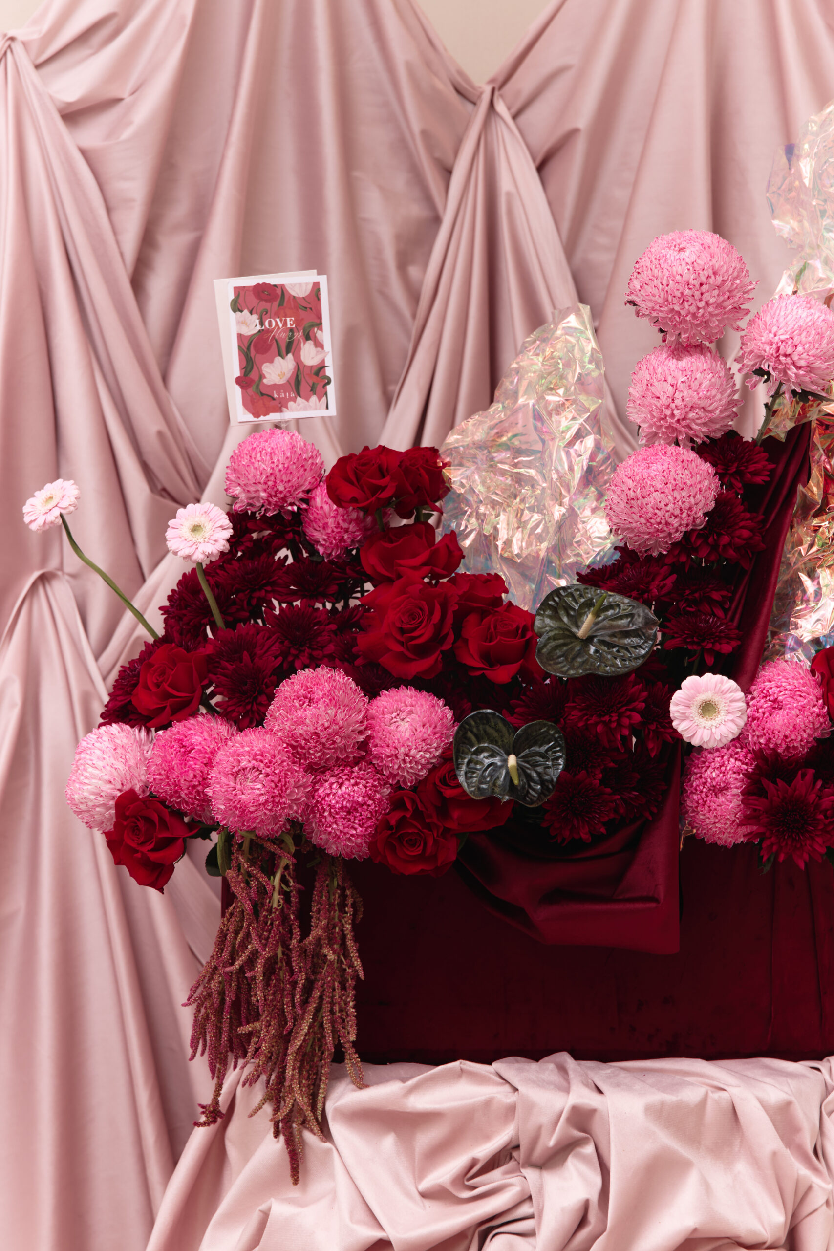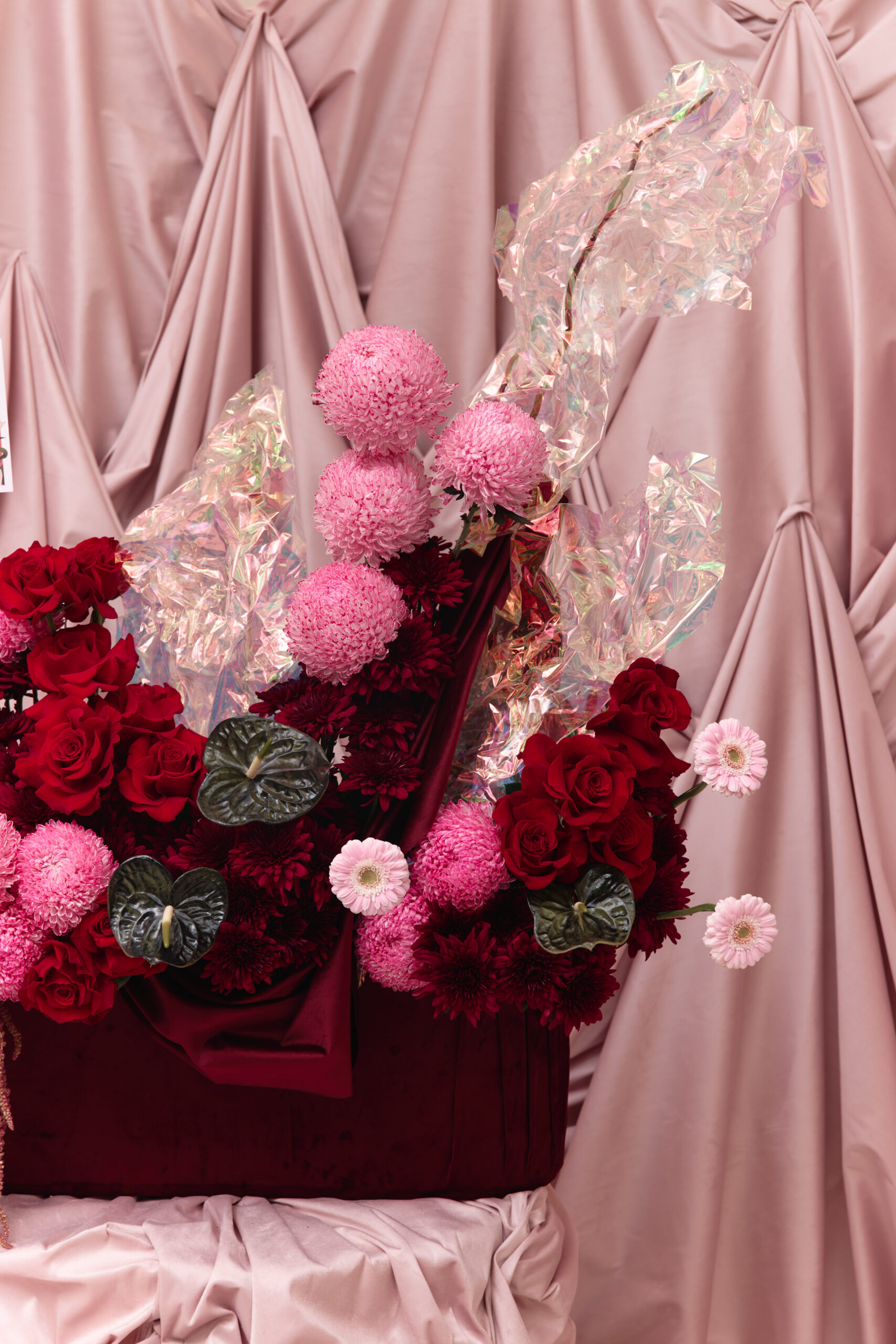 A cascade of pink, red, and maroon mixed flowers in a maroon covered velvet base, with hanging velvet and holographic accents. Flowers may vary based on seasonality and availability, in the case that a flower isn’t available it will be replaced with one of equal or higher value