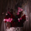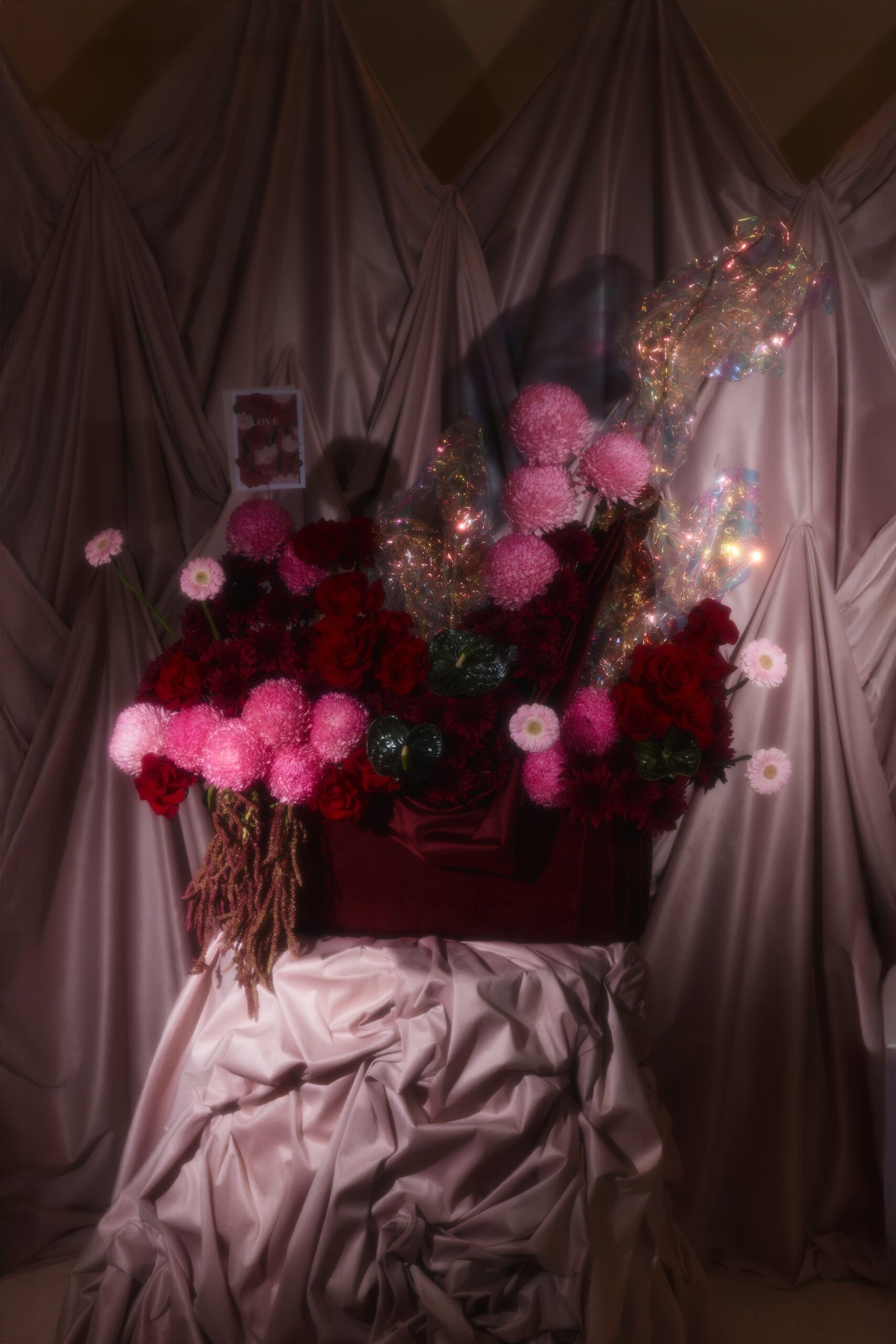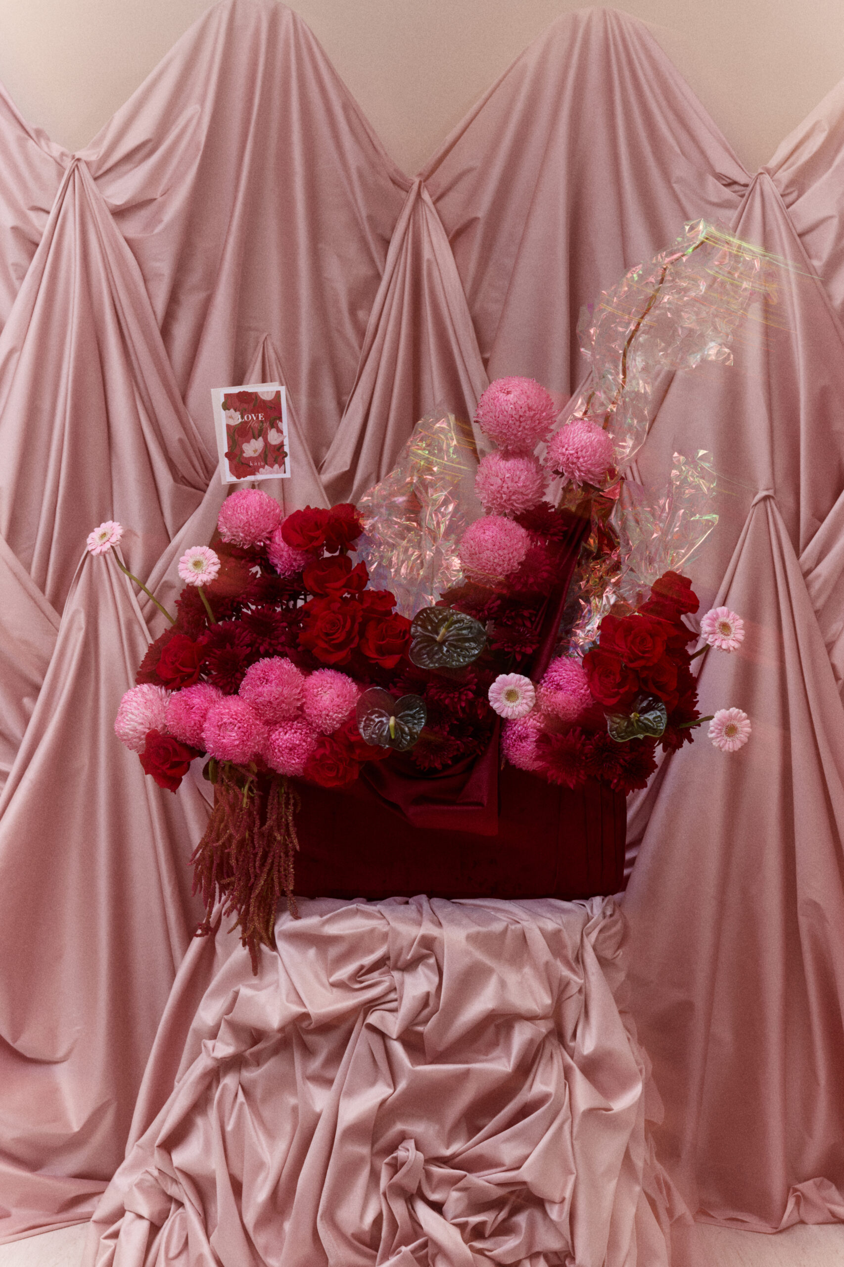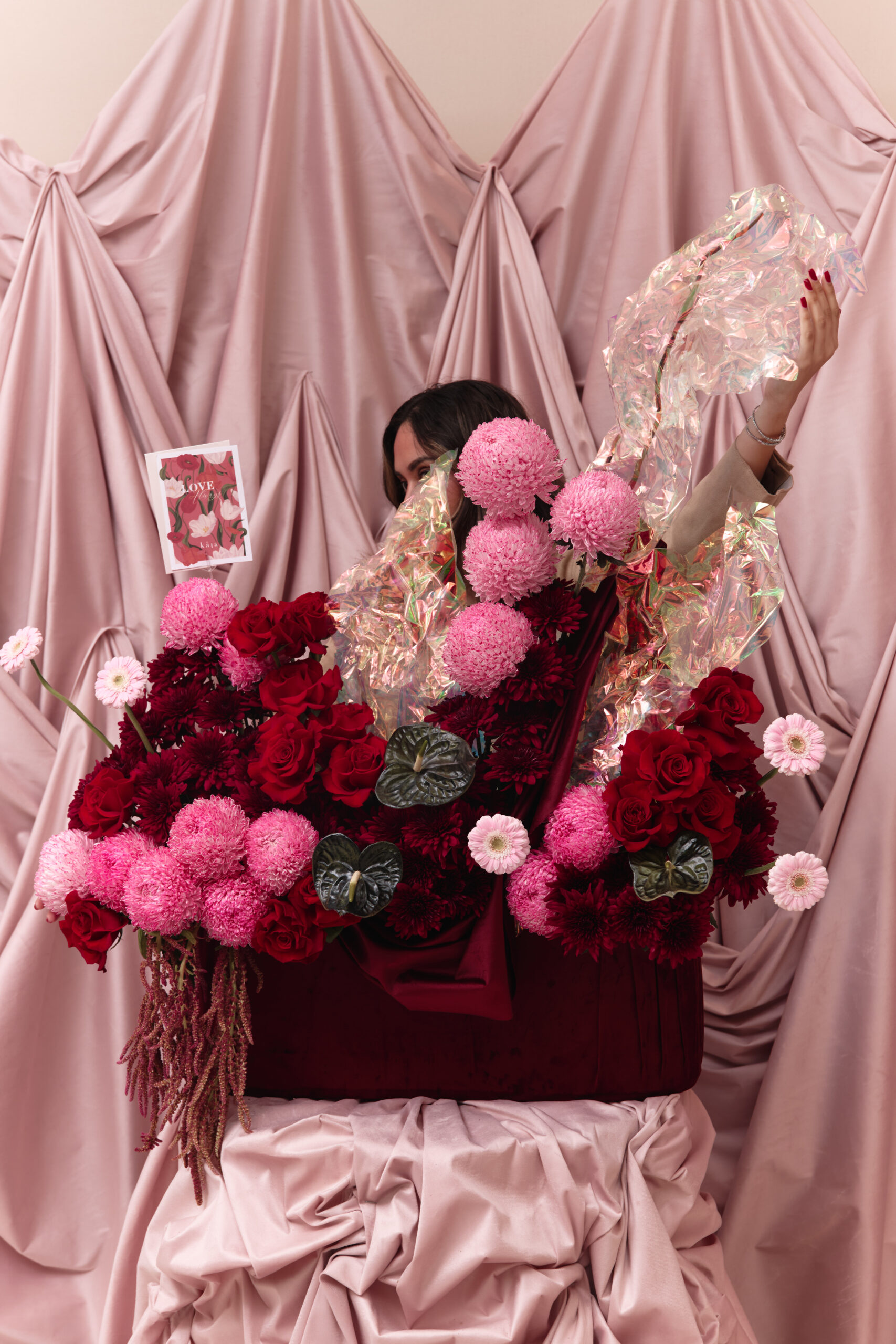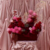 A cascade of pink, red, and maroon mixed flowers in a maroon covered velvet base, with hanging velvet and holographic accents. Flowers may vary based on seasonality and availability, in the case that a flower isn’t available it will be replaced with one of equal or higher value