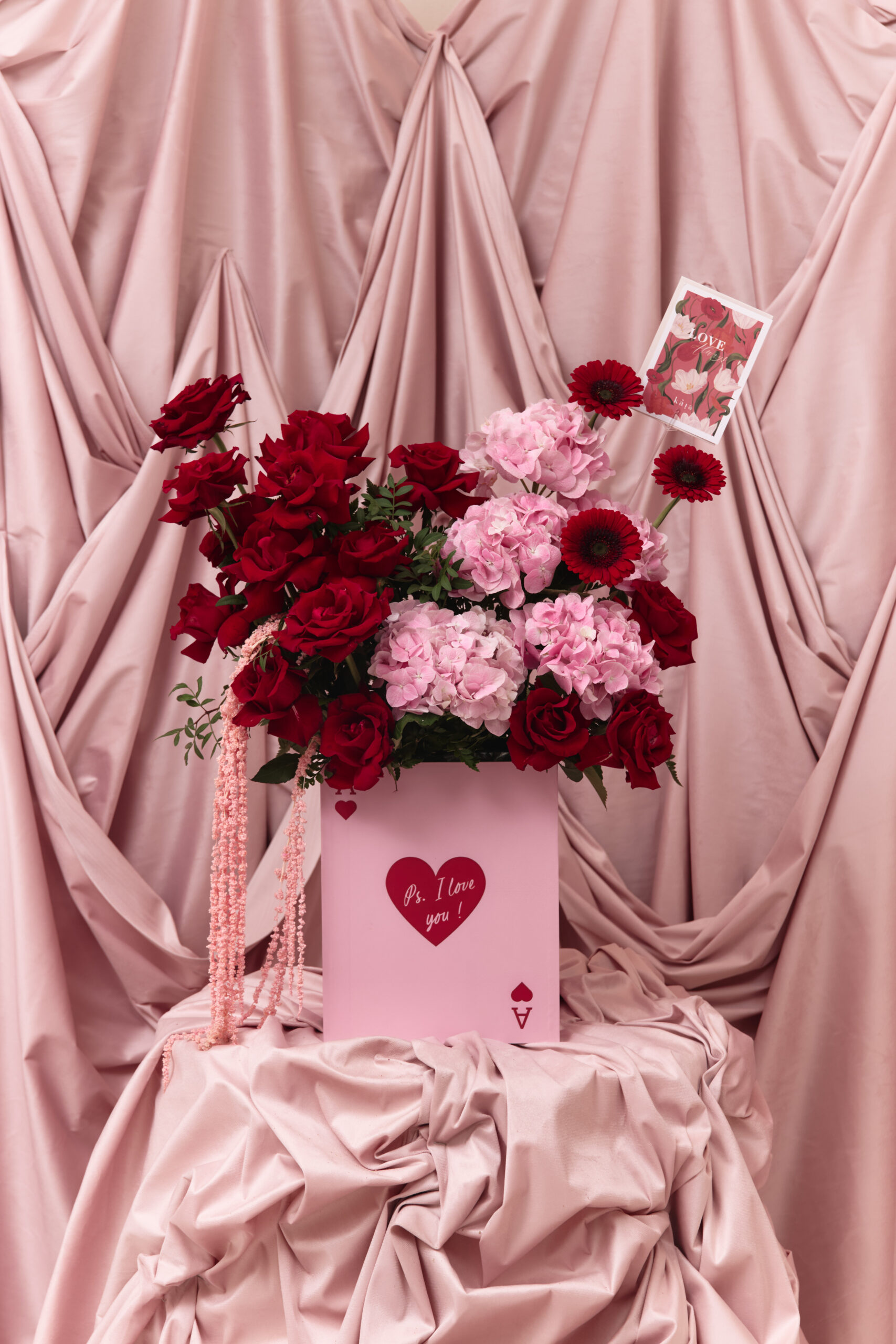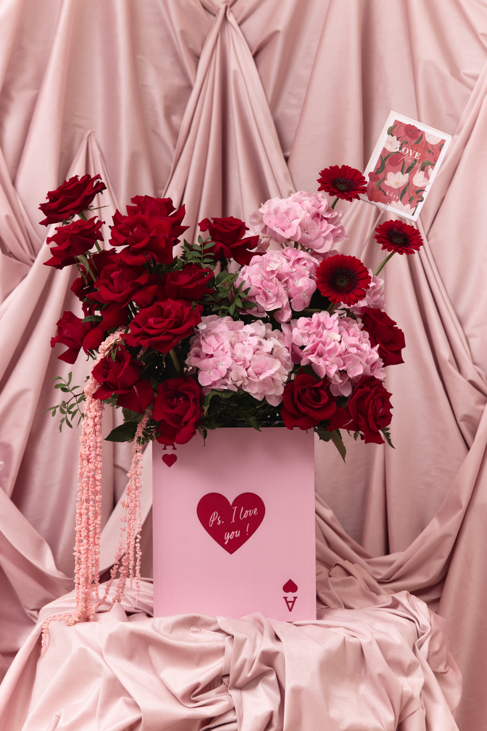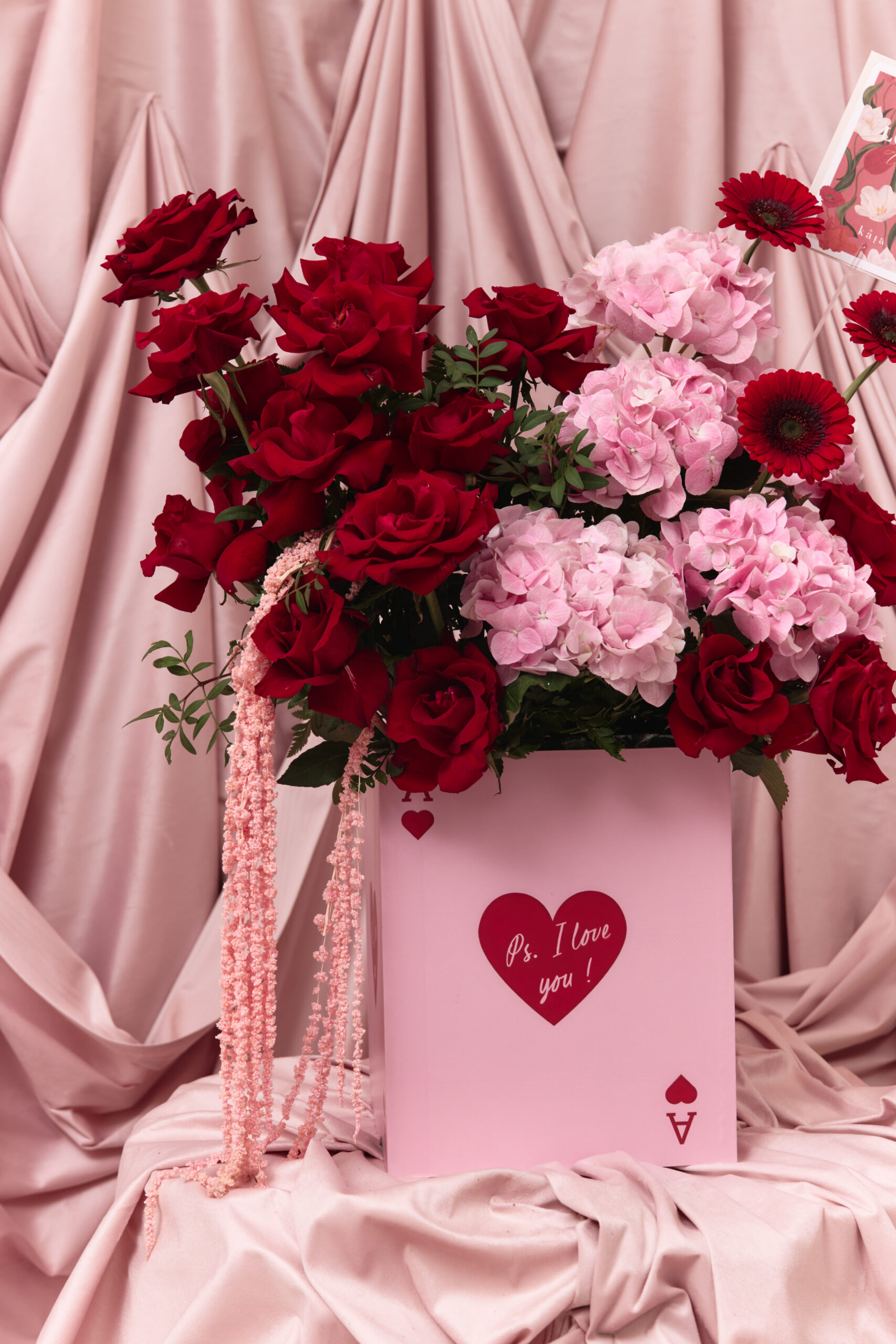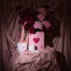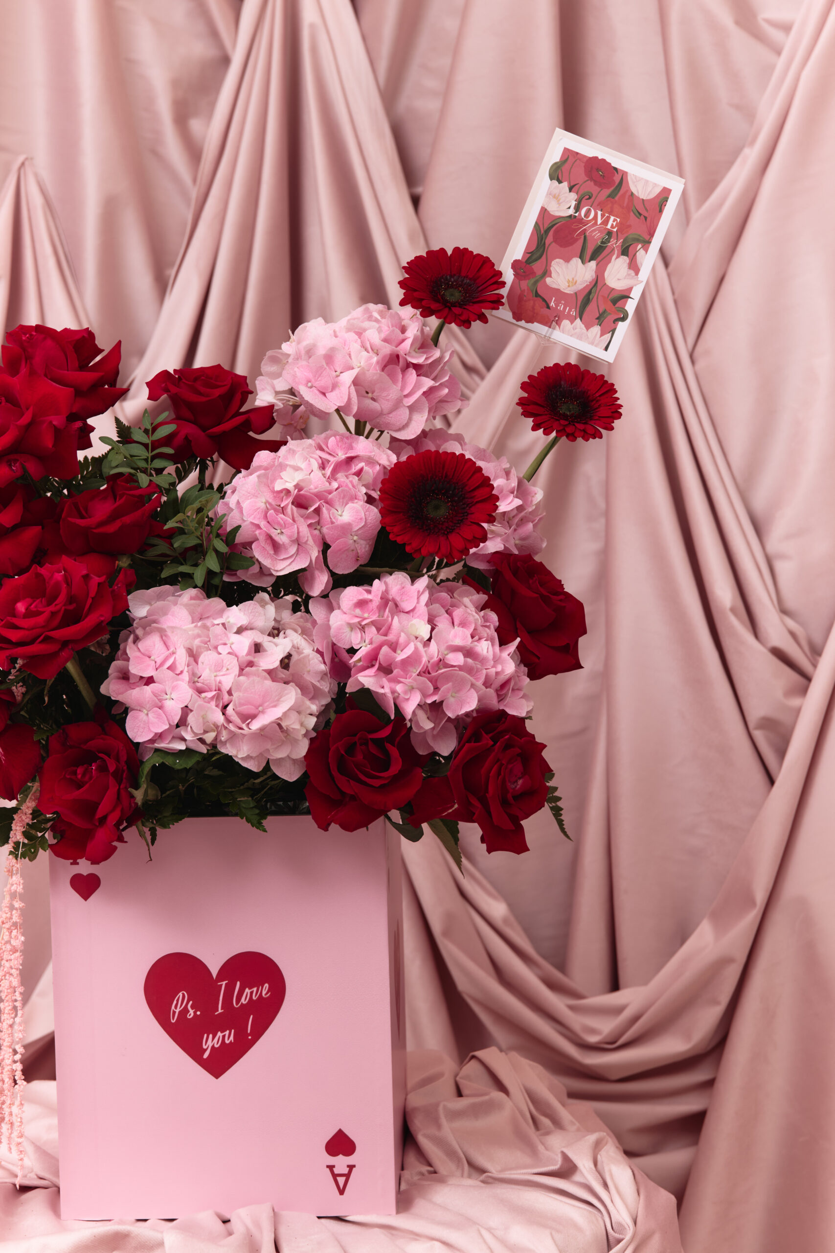 This includes a mix of red and pink flowers arranged in a wooden box with ‘Ps I love you’. Flowers may change based on seasonality and availability, if the exact flower isn’t available, a replacement of same or higher value may be substituted
