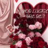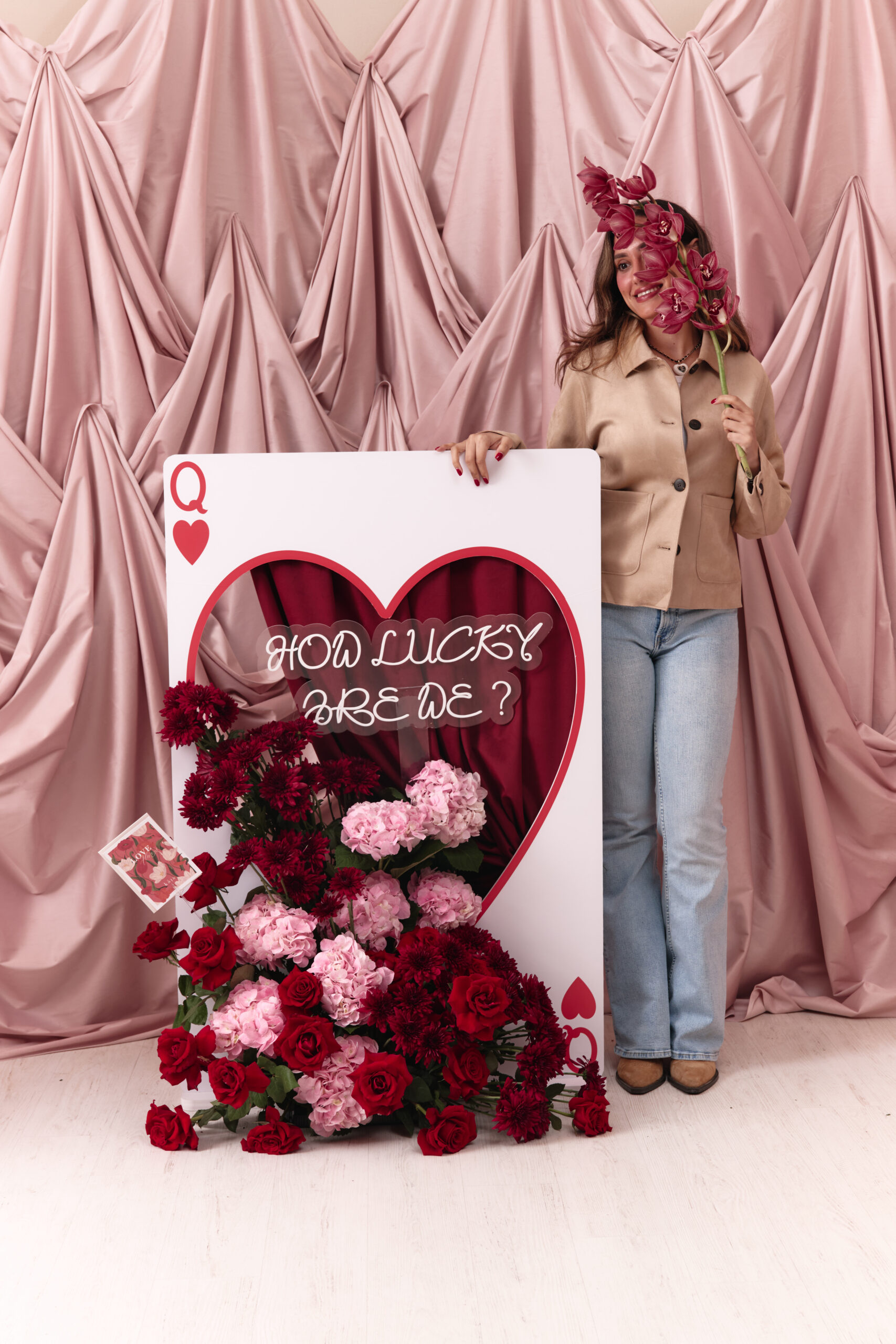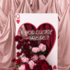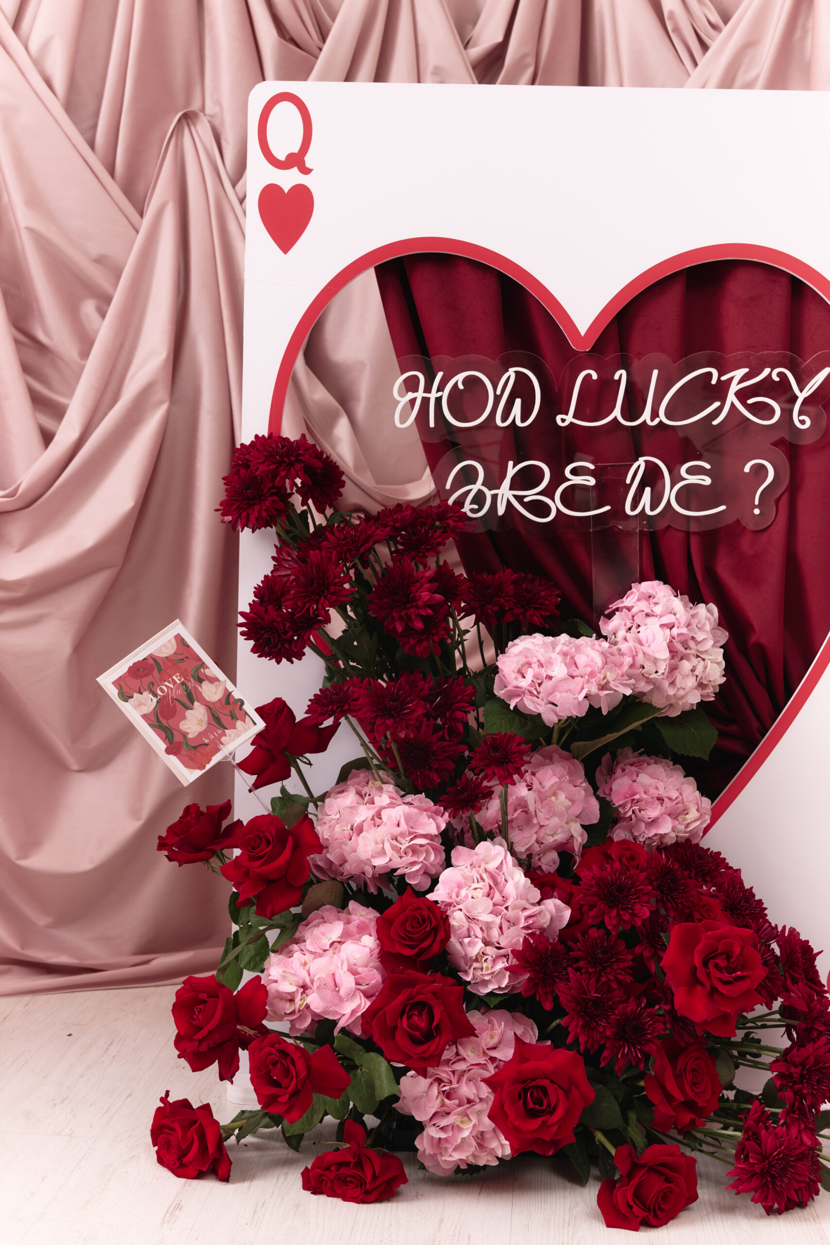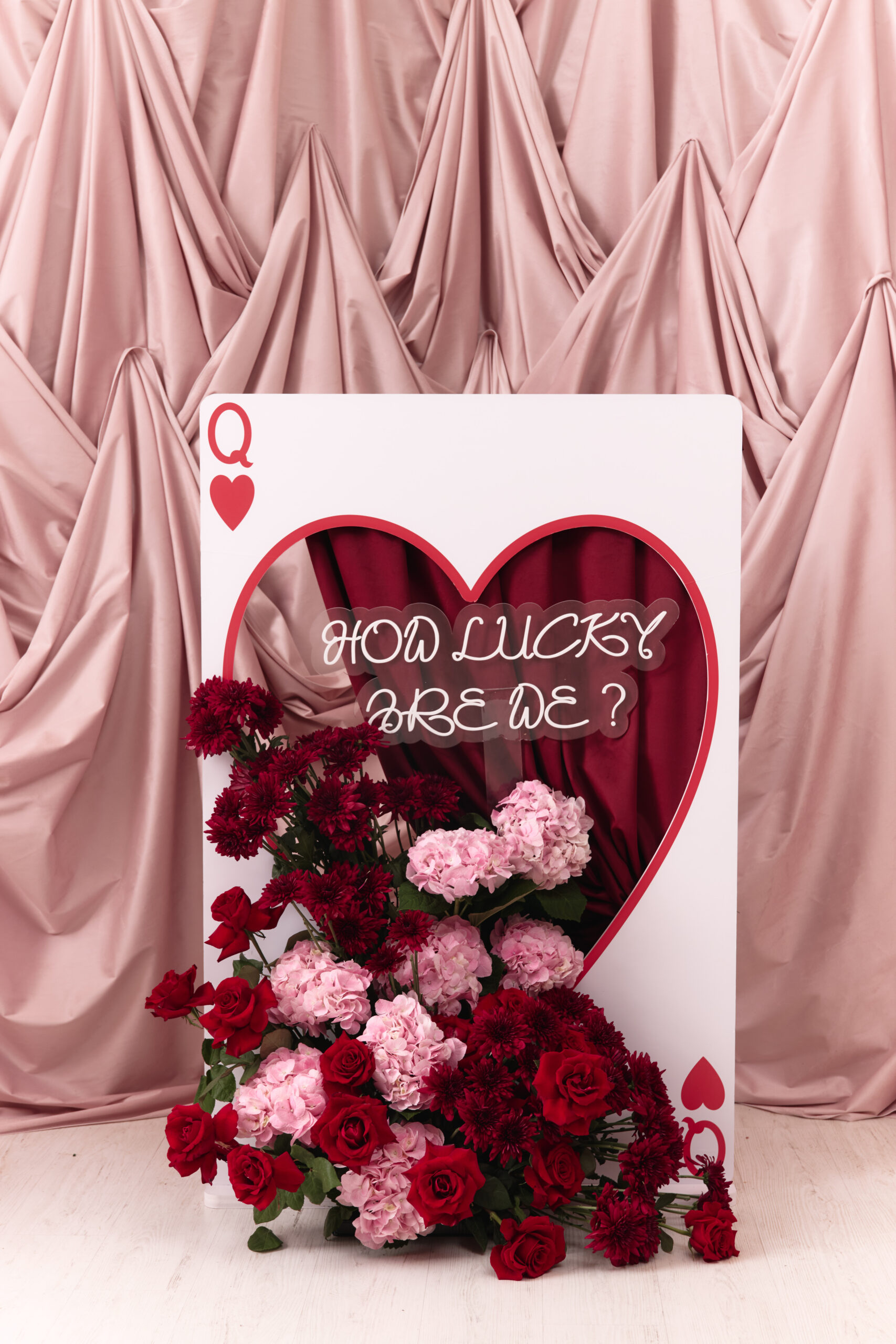 Mixed pink and red flowers adorned on a ‘Queen of cards’ wooden frame with maroon velvet draped behind and message ‘how lucky are we ?’