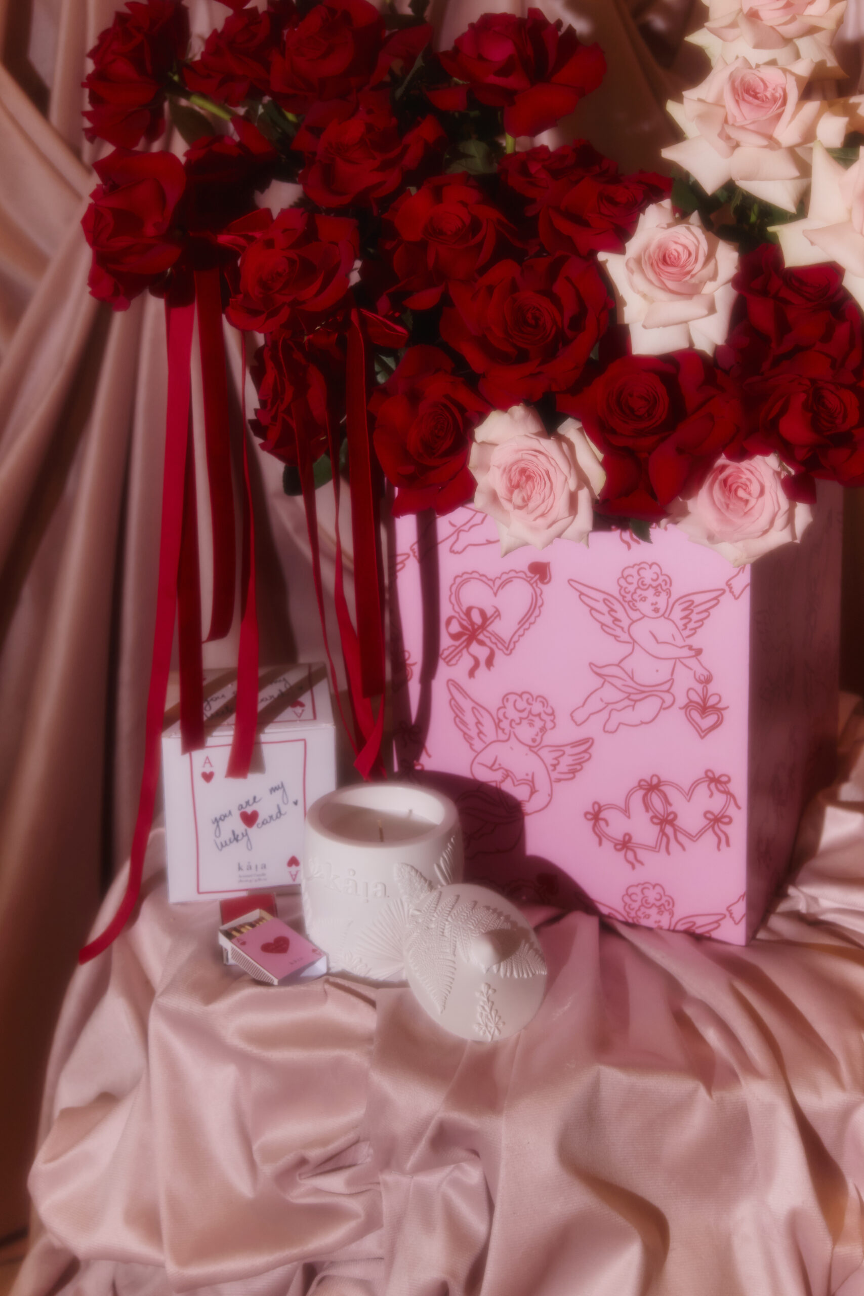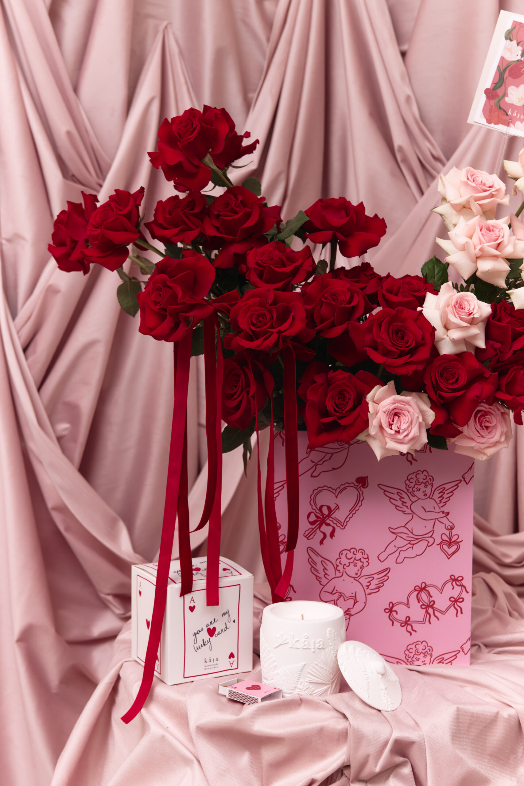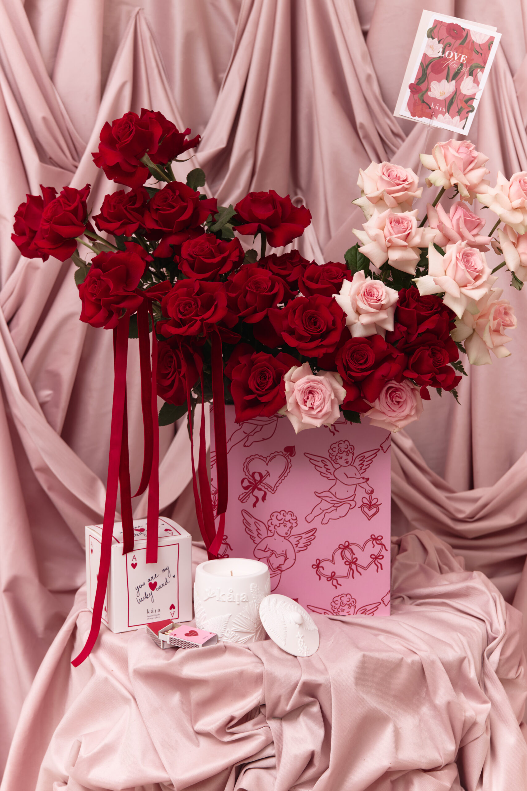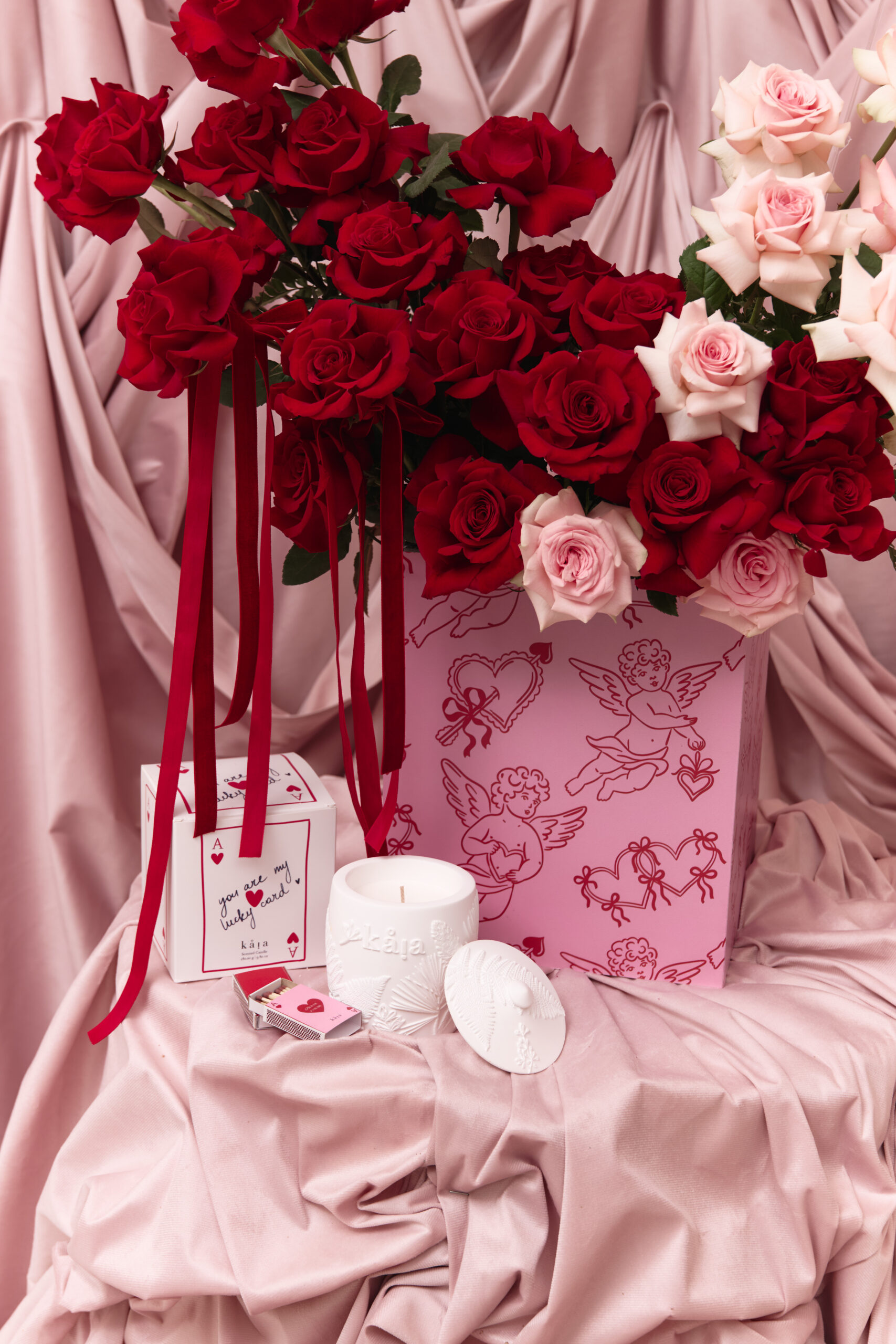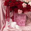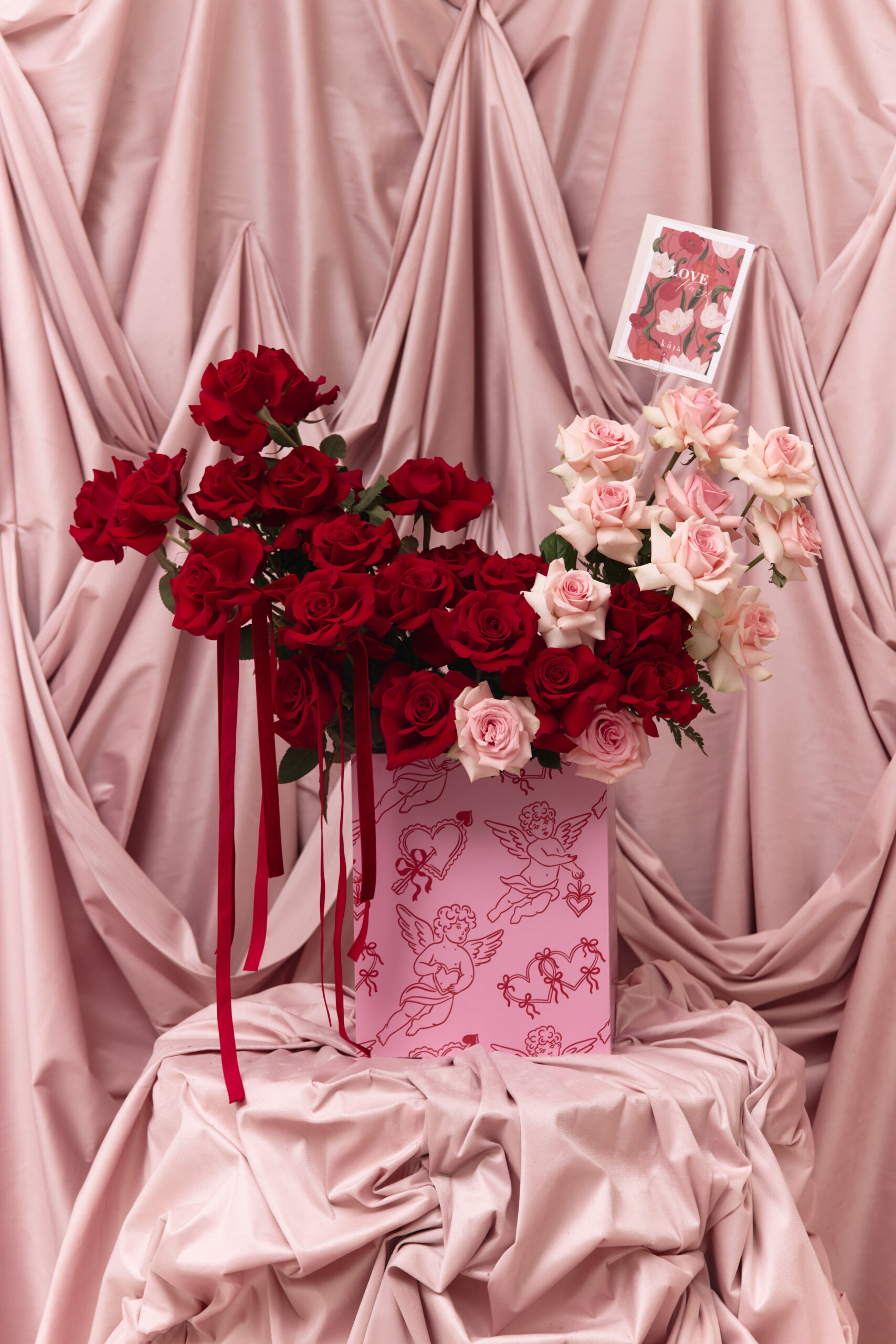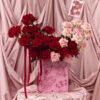 This includes red and pink mixed flowers to be placed in a wooden floral box with pink and red angle prints. Flowers vary based on seasonality and availability. If the exact flower isn’t available, a flower of equal or higher value will be added.
